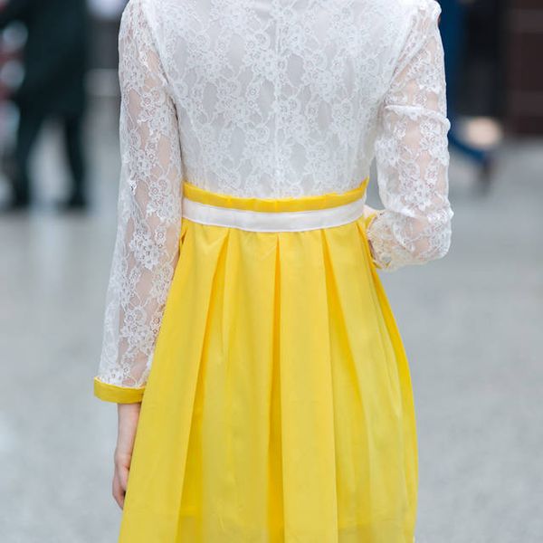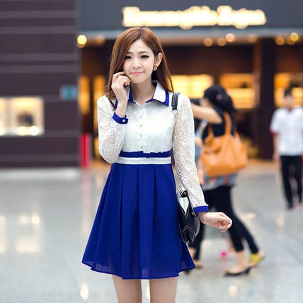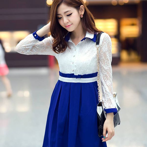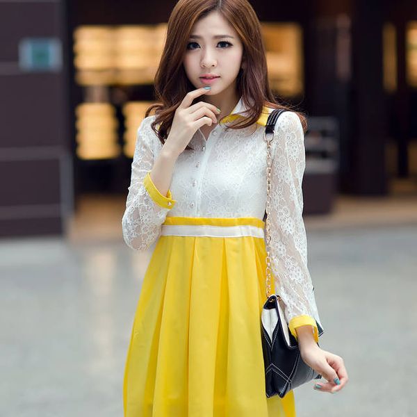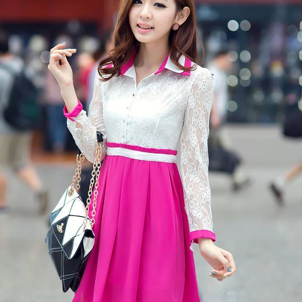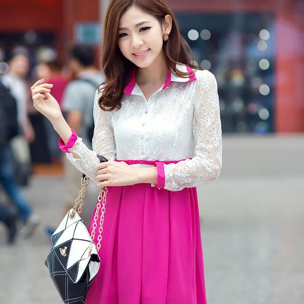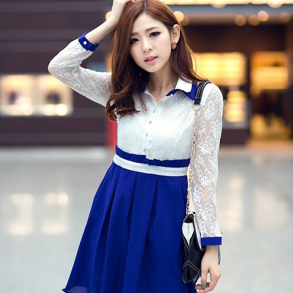 2014 spring chiffon long-sleeved dress stitching lace skirt Korean Slim lapel