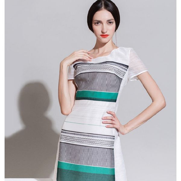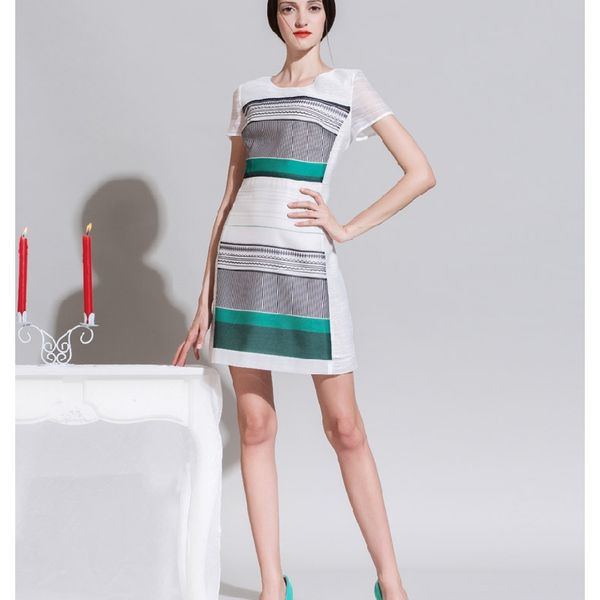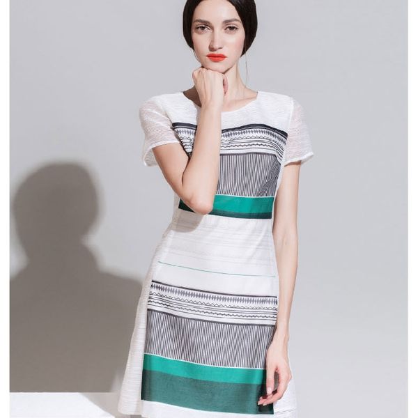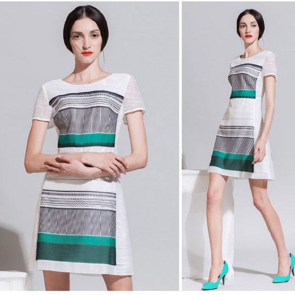 2014欧洲站H版型薄纱条纹印花女装 ol气质修身显瘦连衣裙