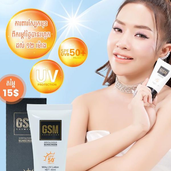 - GSM Sun Screen ជាប្រភេទគ្រីមការពារកម្ដៅថ្ងៃ និងមាន SPF ការពារកម្ដៅថ្ងៃបានរហូតដល់ 50PA++ and UV Protection ជួយផ្ដល់សំណើមដល់ស្បែកមុខ ធ្វើឪ្យសភ្លឺ ម៉ត់រលោងបែបធម្មជាតិ