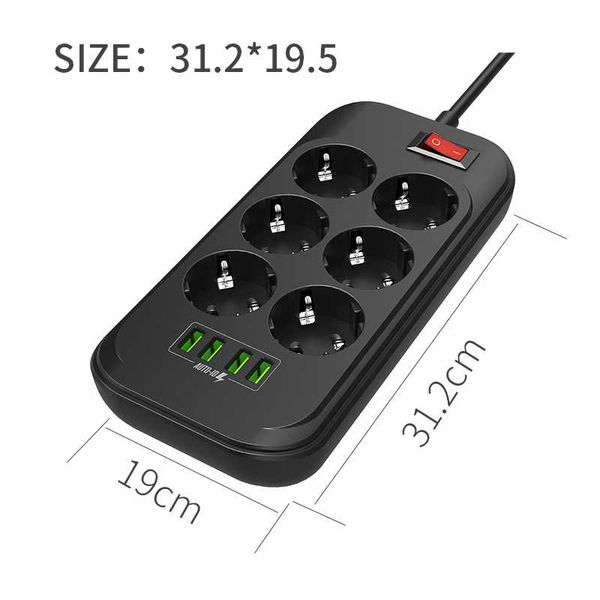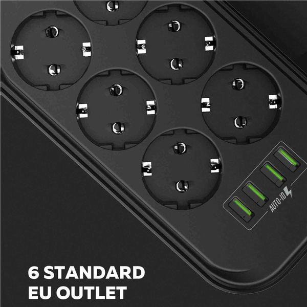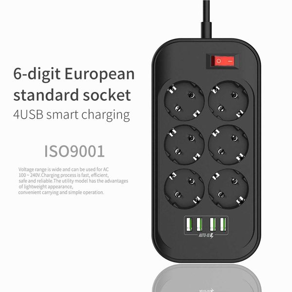 EU Power Strip 6 Outlet 4 USB Charging Ports 2500W Power Strip Flat Plug Smart Extension Socket