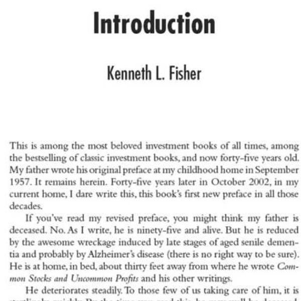Widely respected and admired, Philip Fisher is among the most influential investors of all time. His investment philosophies, introduced almost forty years ago, are not only studied and applied by today's financiers and investors, but are also regarded by many as gospel. This book is invaluable reading and has been since it was first published in 1958. The updated paperback retains the investment wisdom of the original edition and includes the perspectives of the author's son Ken Fisher, an investment guru in his own right in an expanded preface and introduction"I sought out Phil Fisher after reading his Common Stocks and Uncommon Profits...A thorough understanding of the business, obtained by using Phil's techniques...enables one to make intelligent investment commitments."