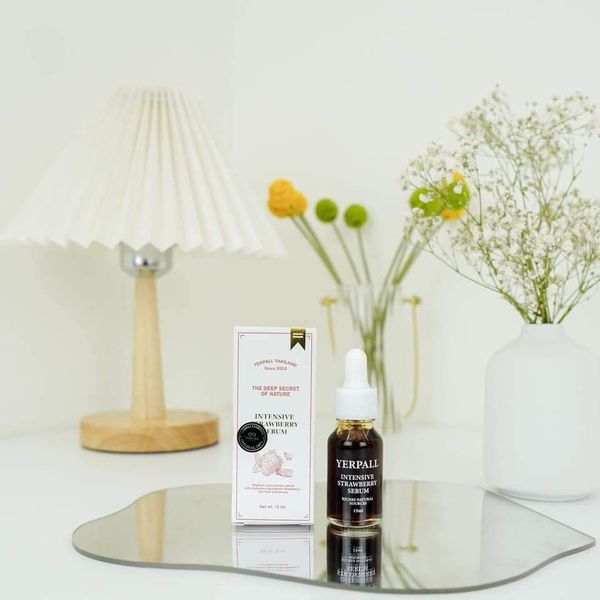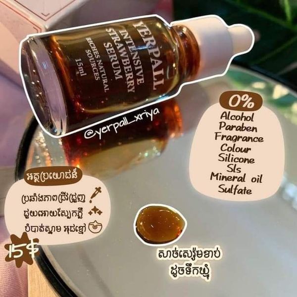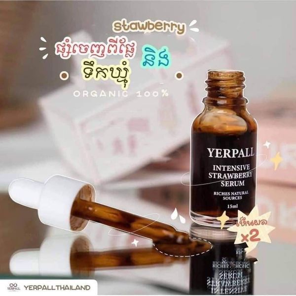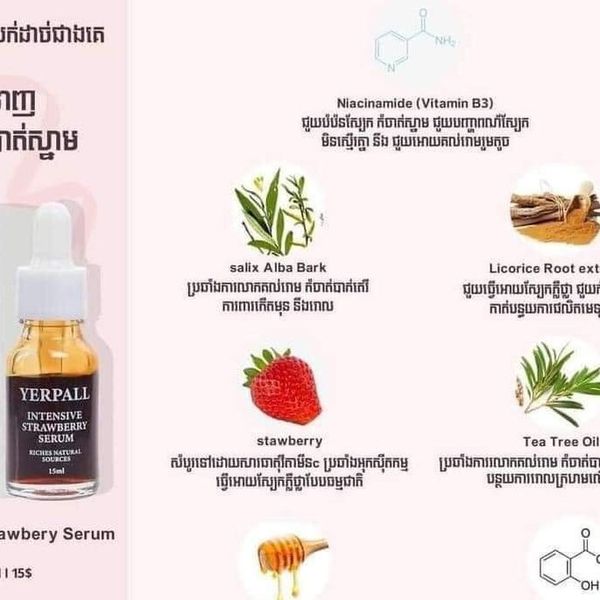 « Yerpell strawberry serum »? សេរ៉ូម organic ដែលផលិតចេញពីសារធាតុធម្មជាតិជាច្រើនប្រភែទរួមបញ្ជូលគ្នាដូចជា : ទឹកឃ្មុំ ផ្លែស្រ្តបឺរី Tea tree oil , Vitamin b3( Niacinamide ) , Pink bark extract រូមបញ្ជូលគ្នាក្នុងដបតែមួយដែលមានតួនាទីកំចាត់ស្នាម អុជខ្មៅ ស្នាមដោយសារមុន នឹងជួយអោយស្បែករឹងមាំមានសុខភាពល្អ?