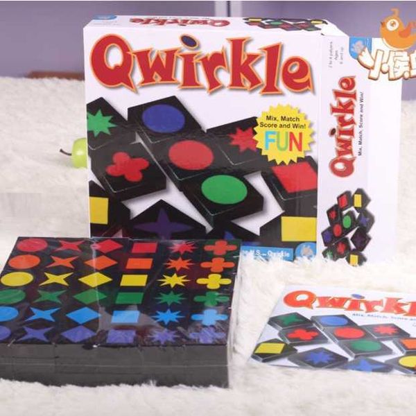 10The abstract game of Qwirkle consists of 108 wooden blocks with six different shapes in six different colors. There is no board, players simply use an available flat surface. Players begin the game with six blocks. The start player places blocks of a single matching attribute (color or shape but not both) on the table. Thereafter, a player adds blocks adjacent to at least one previously played block. The blocks must all be played in a line and match, without duplicates, either the color or shape of the previous block. Players score one point for each block played plus all blocks adjacent. It is possible for a block to score in more than one direction. If a player completes a line containing all six shapes or colors, an additional six points are scored. The player then refills his hand to six blocks. The game ends when the draw bag is depleted and one player plays all of his remaining blocks, earning a six point bonus. The player with the high score wins.