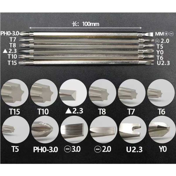 Bits included: Torx T5, T6, T7, T8, T10, T15, Tri-wing Y0, U-shaped U2.3, PH0, Flat (-)2.0, (-)3.0, Triangle 2.3mm.