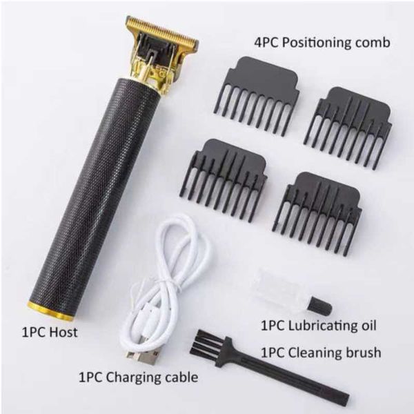 Package list: 1 main unit, 4 positioning combs, 1 charging cable, 1 lubricating oil, 1 cleaning brush