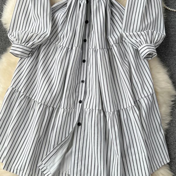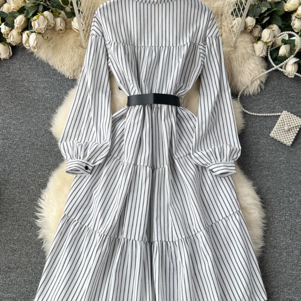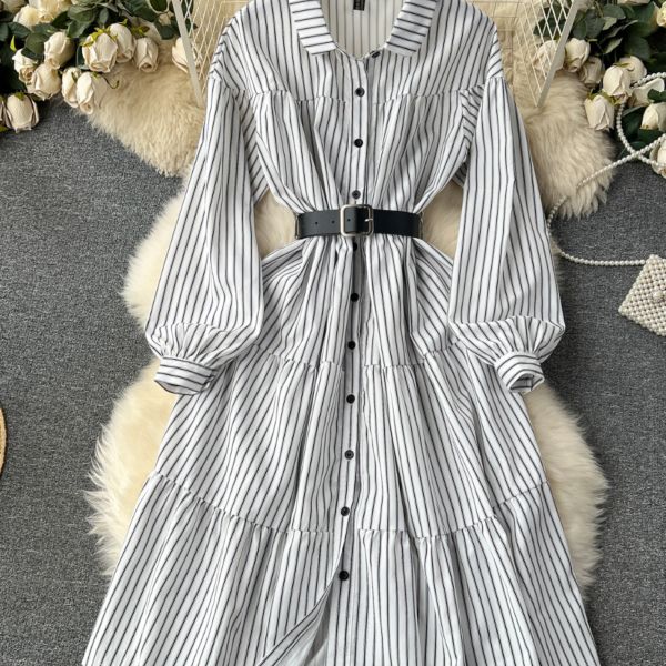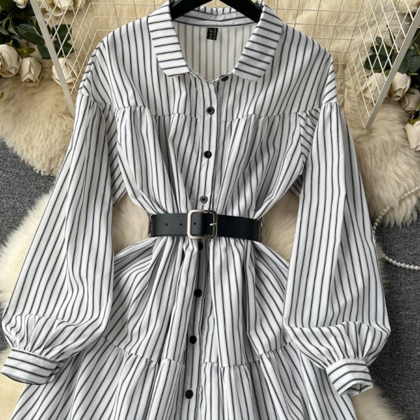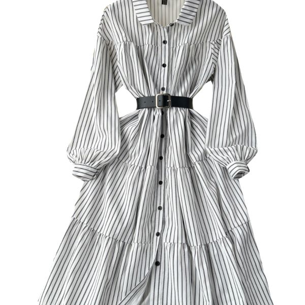 Korean sweet striped dress for women early autumn new loose casual long-sleeved single-breasted waist slim shirt dress