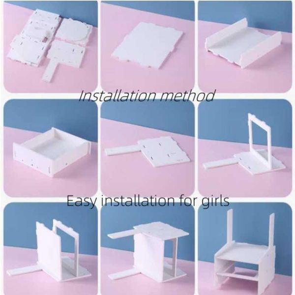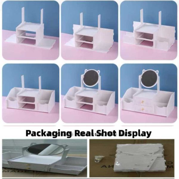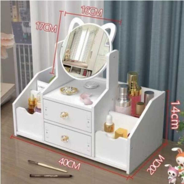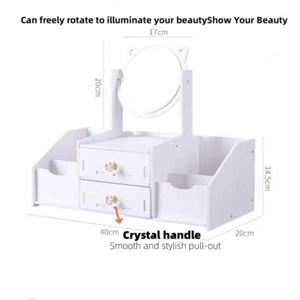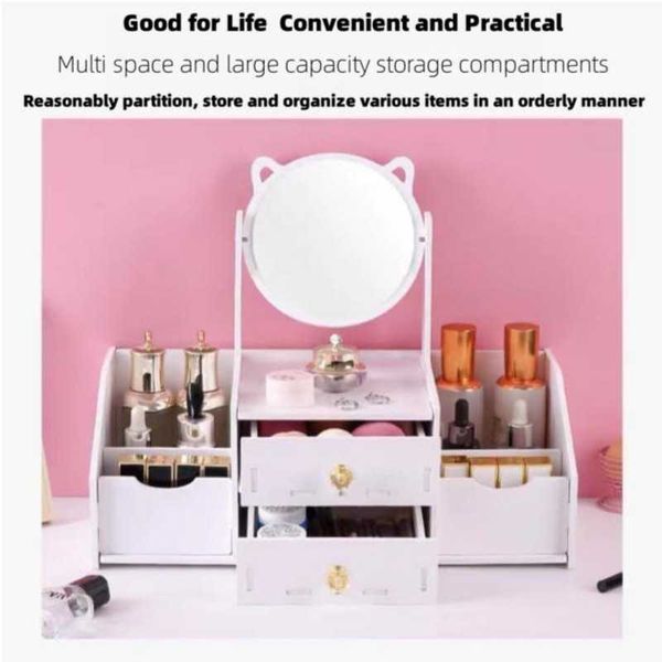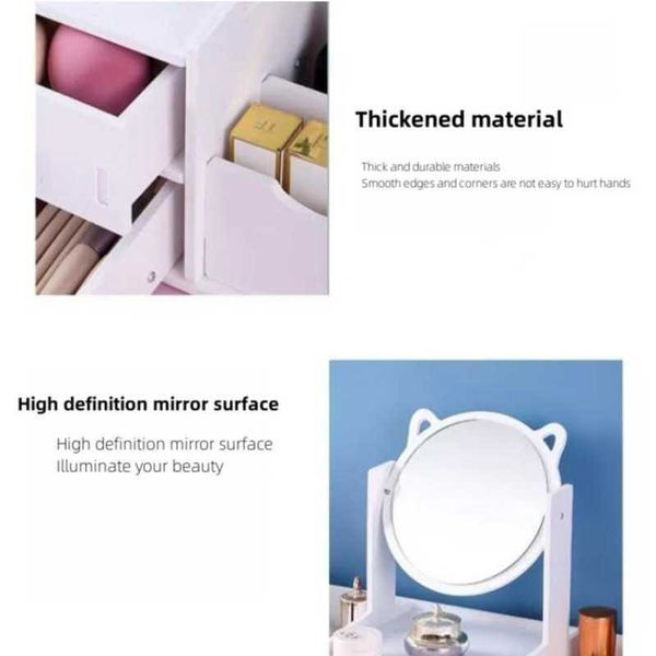 Large bilateral double suction cat ear glasses, cosmetic storage box with mirror, rotatable desktop, drawer style dressing table, skincare and organizing box, dormitory storage rack