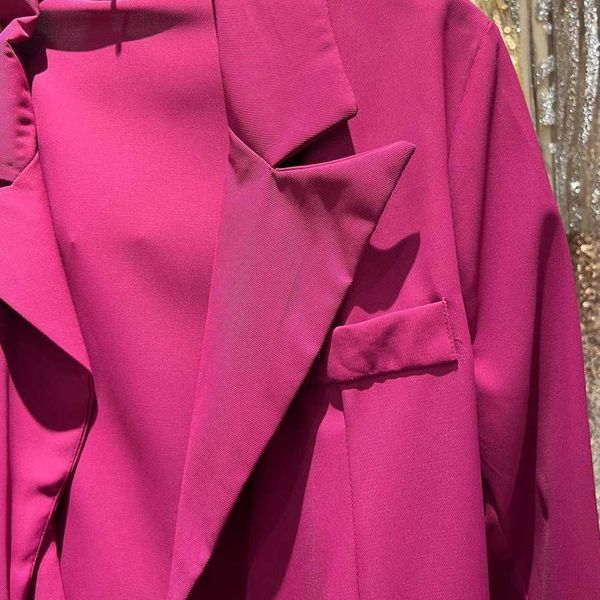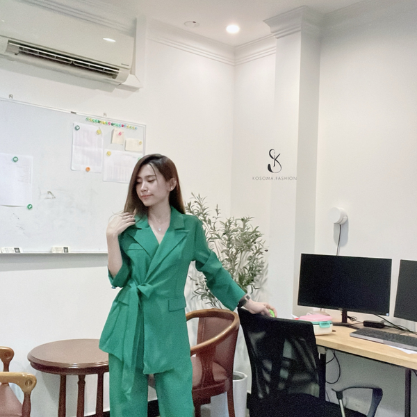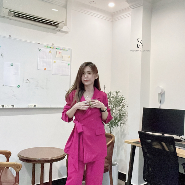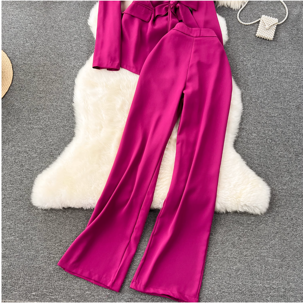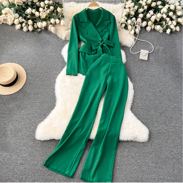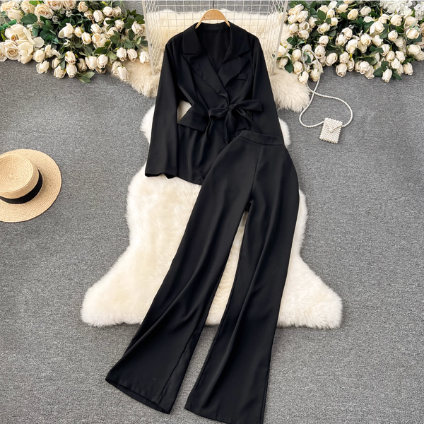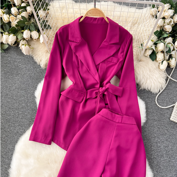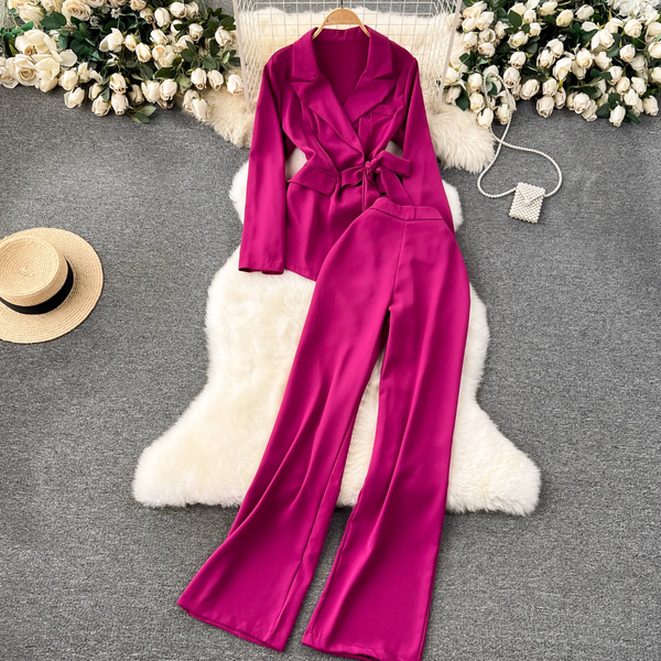 Luxurious lady wears elegant blazer with straps to slim the waist, long wide-leg pants and a fashionable two-piece suit