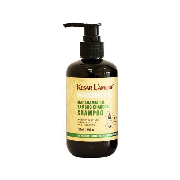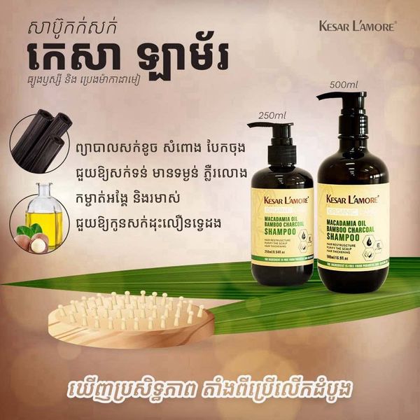 Kesar L’amore Macadamia Oil Bamboo Charcoal Shampoo - សាប៊ូកក់សក់ •ព្យាបាលសក់ខូច សំពោង បែកចុង •ជួយអោយសក់ទន់ មានទម្ងន់ ភ្លឺរលោង •កម្ចាត់អង្គែ និងរមាស់ •ជួយឱ្យកូនសក់ដុះលឿនទ្វេដង