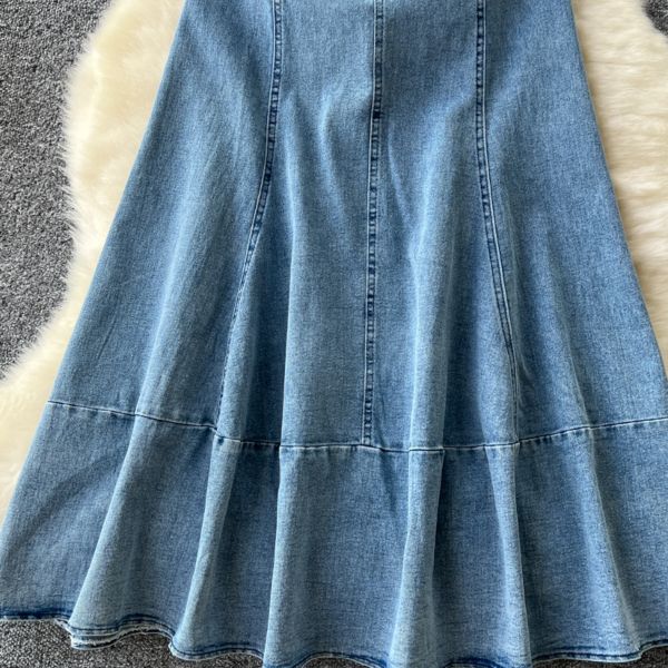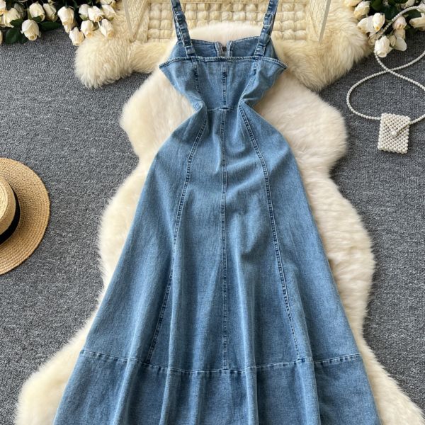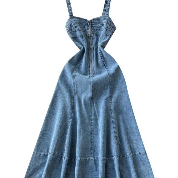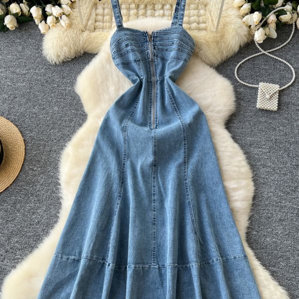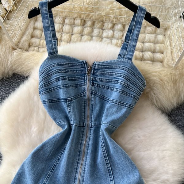 Korean style fashionable versatile suspender denim dress for women, design zipper tube top, slim waist, ruffled long skirt