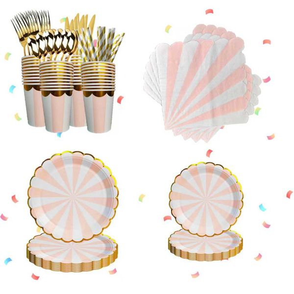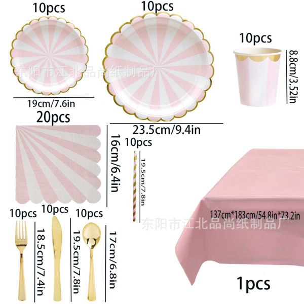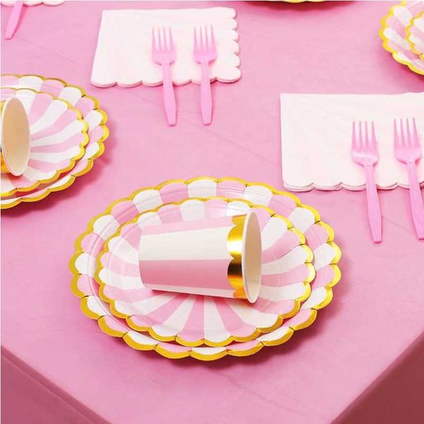 Disposable paper tray, paper cup, tissue paper, gold edged paper tray, paper cup, dessert party, pink striped paper tray, tableware