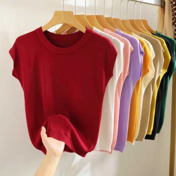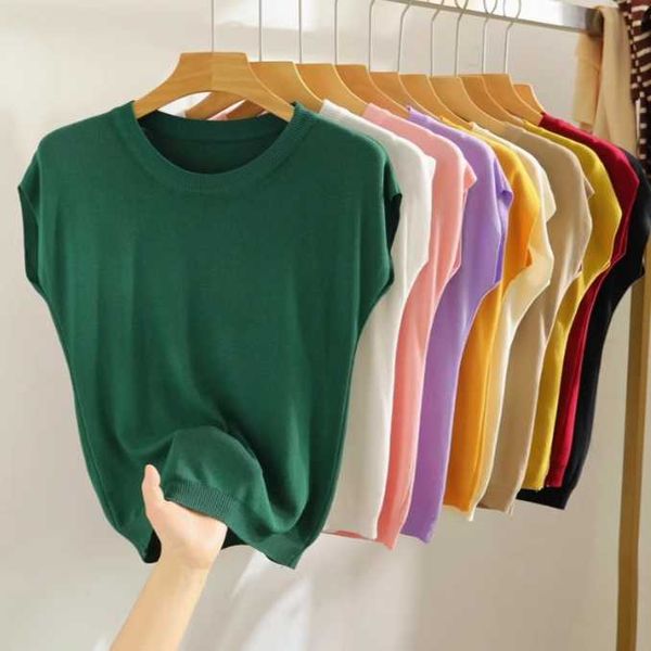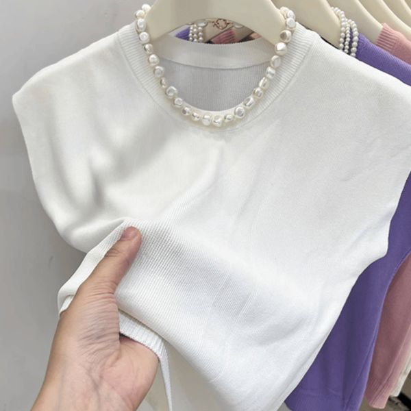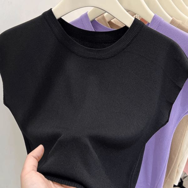 Ice silk T-shirt women's 2024 summer new style all-match solid color sleeveless knitted vest loose short waistcoat top thin