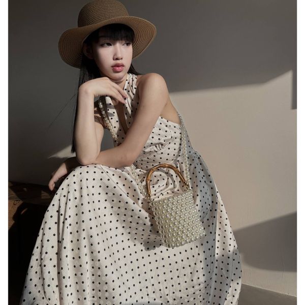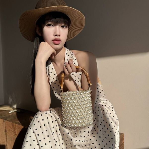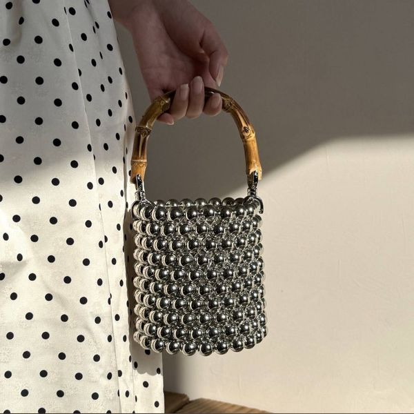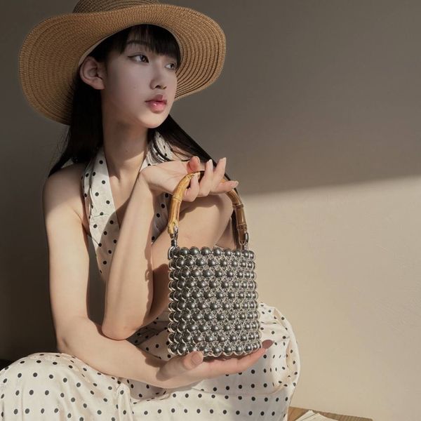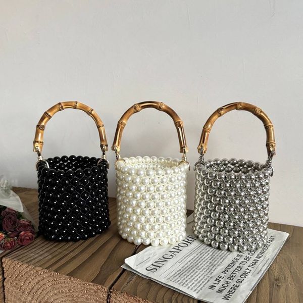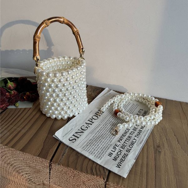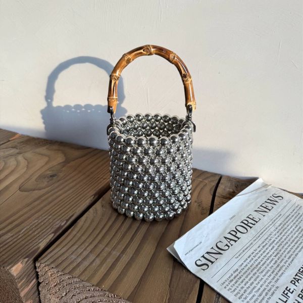 National style new Chinese bucket bag bamboo handbag high-end metal feel niche pearl bag