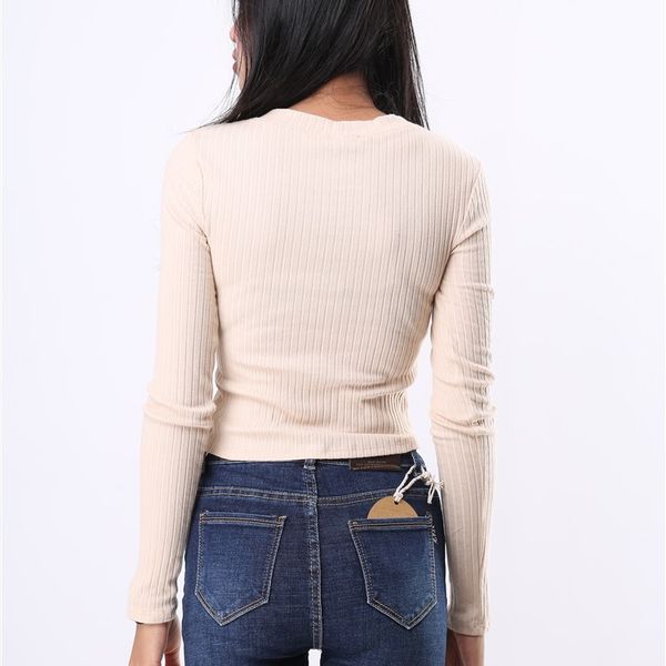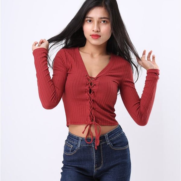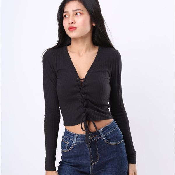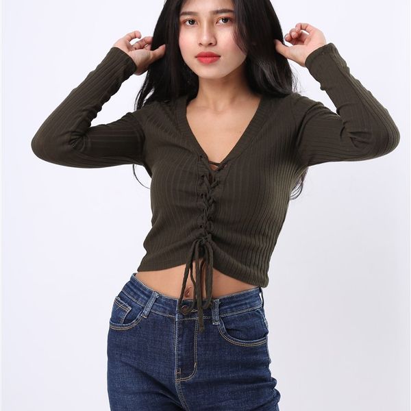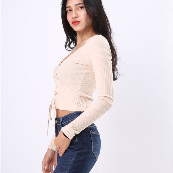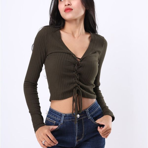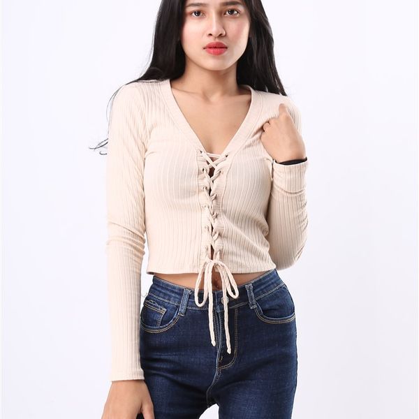 Women's New Fashion Long Sleeve V-neck Knitted Cardigan Shirt with Front Cross Strap