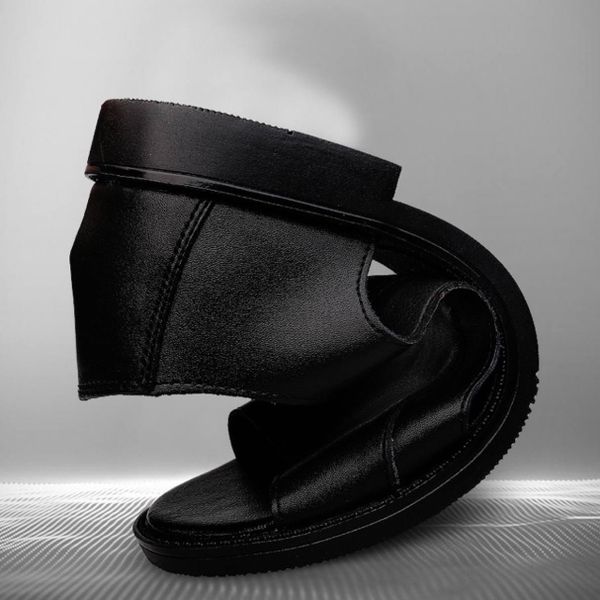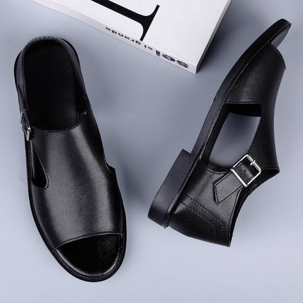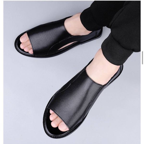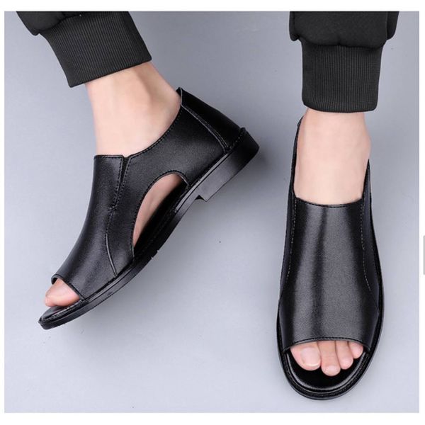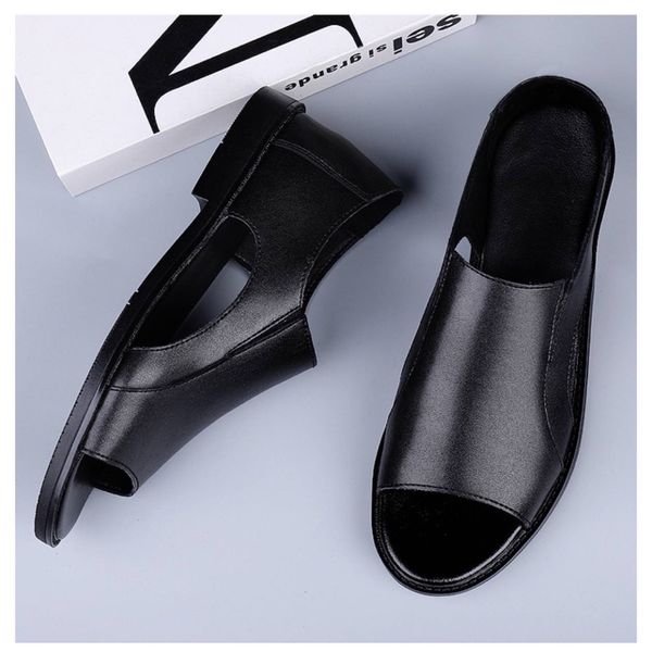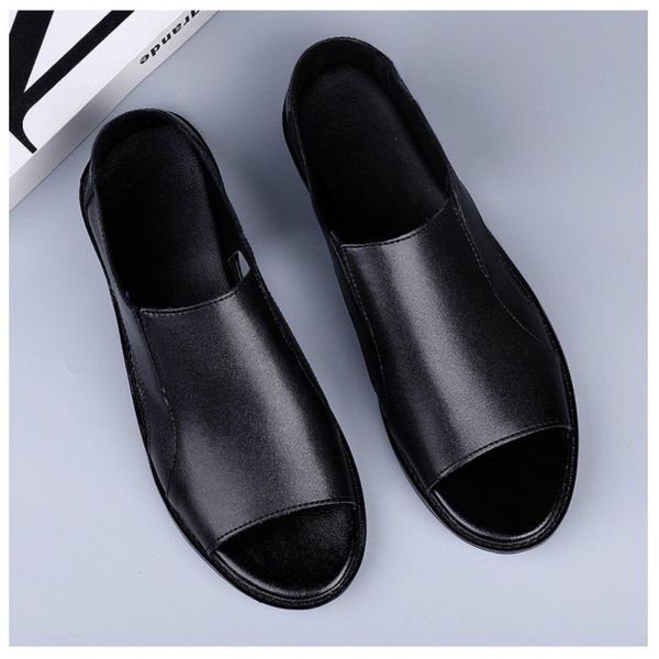Men's Shoes Sandals Beach Cave Shoes Low-top Open Toe Cowhide Slip-on Large Size Breathable Casual Pure Black
