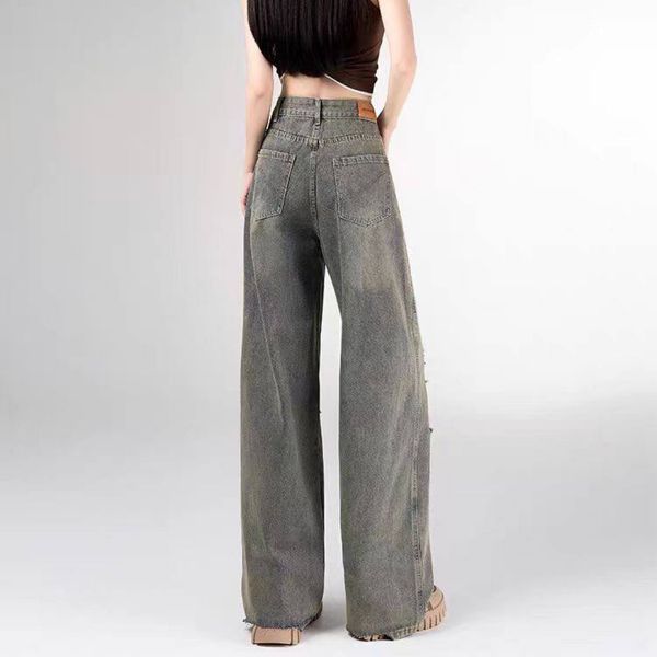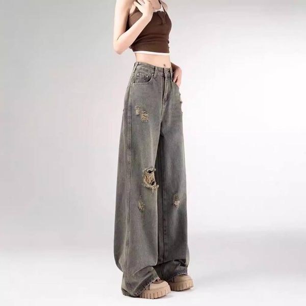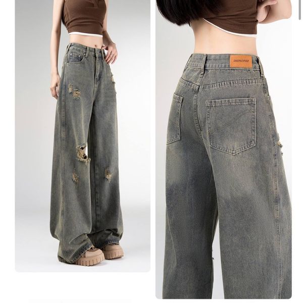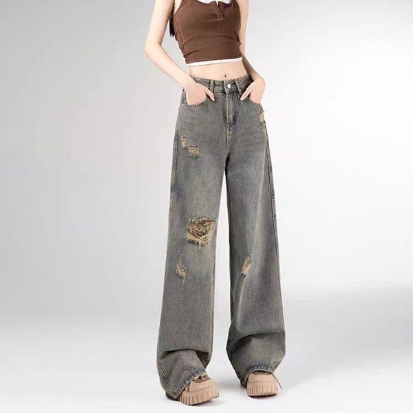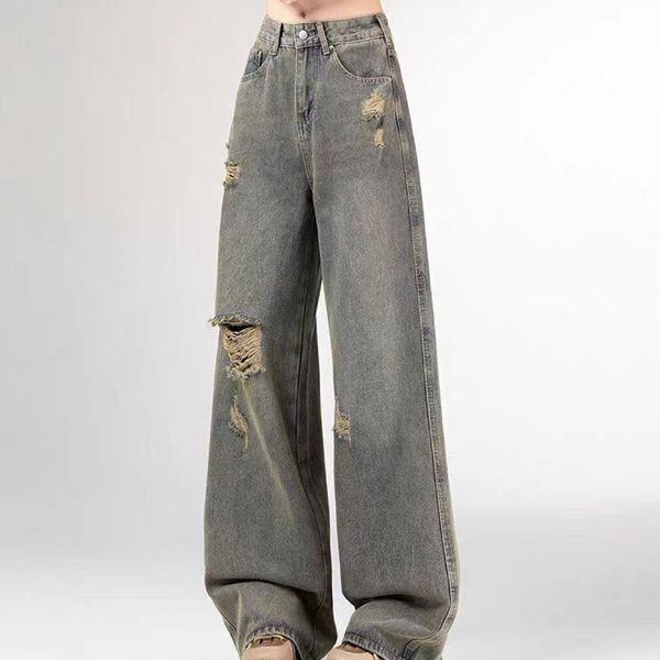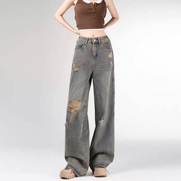 Small Retro Ripped Straight Jeans Women's Autumn New Design Sense All-match Loose High Waist Wide Leg Pants