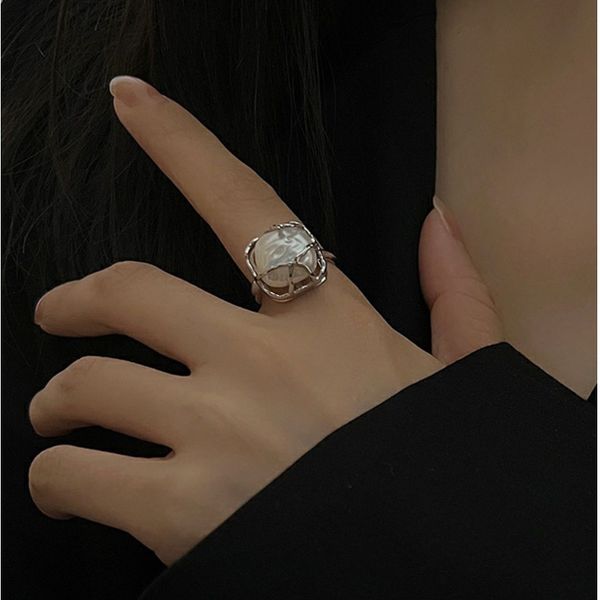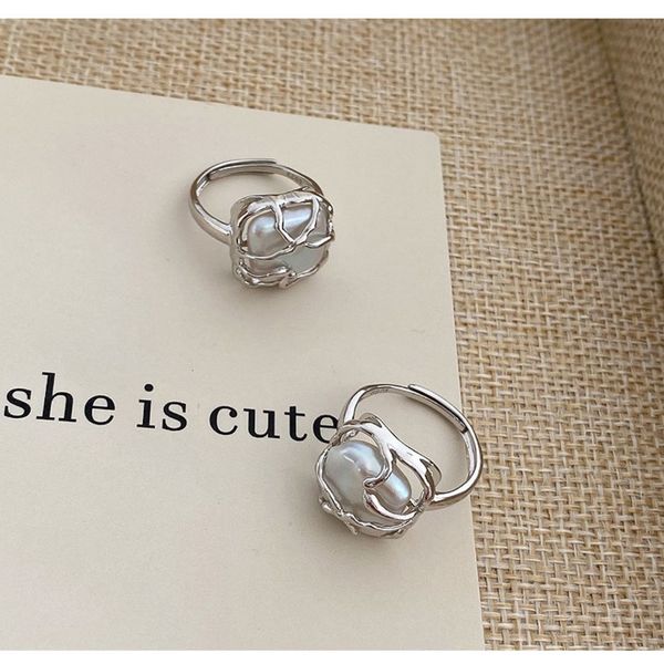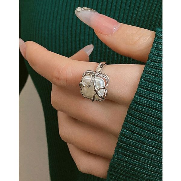 S925 Sterling Silver Baroque Pearl Ring Feminine Style Light Luxury Design Square Open Ring Jewelry