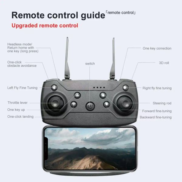 The drone is equipped with a 90 degree adjustable lens, a 1080P high-definition WIFI camera, and FPV transmission function. During drone flight, real-time video can be directly transmitted to the phone.
