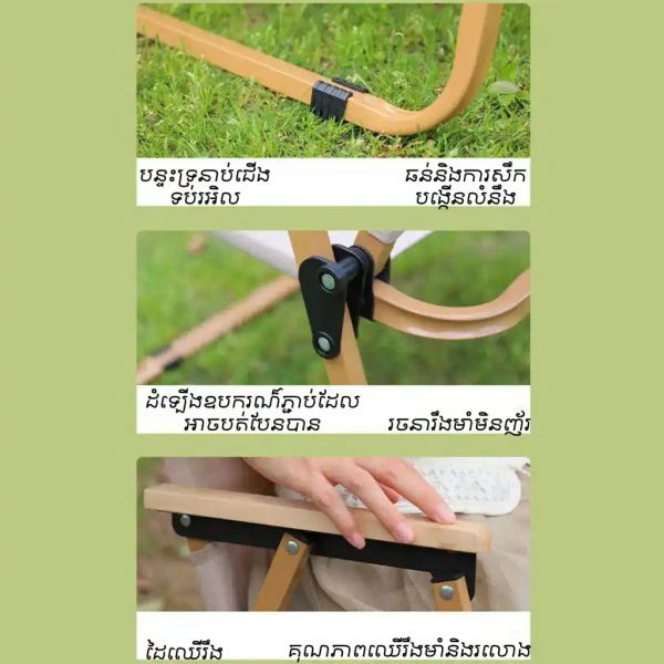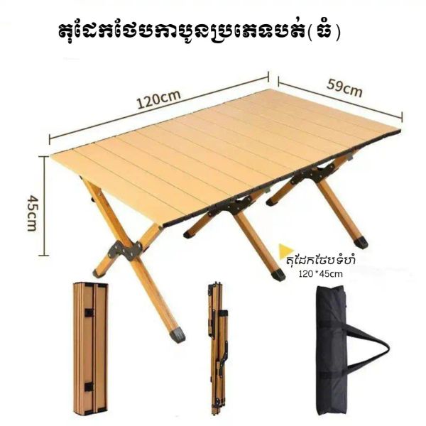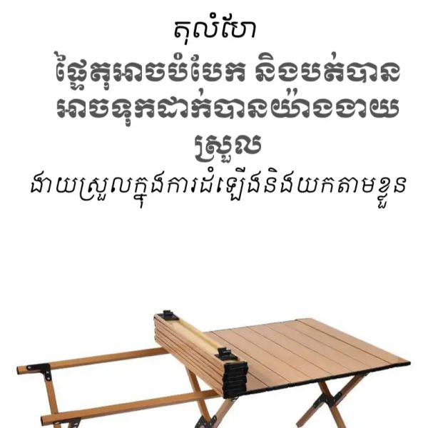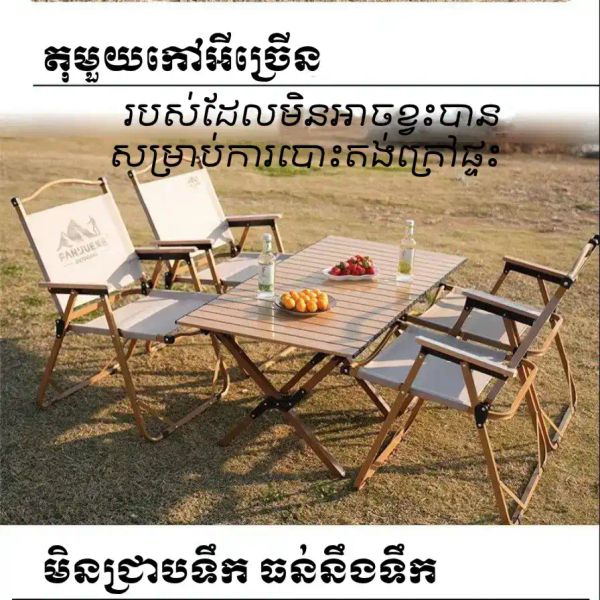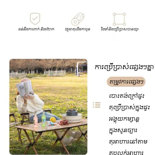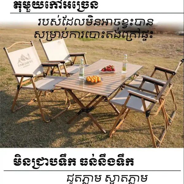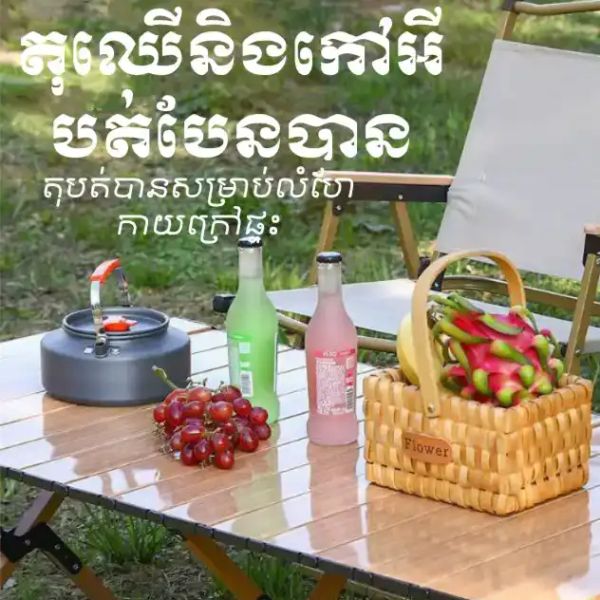 នេះជាតុ និងកៅអីដែលអាចបត់បាននៅខាងក្រៅ ធ្វើពីលោហធាតុអាលុយមីញ៉ូម ទម្ងន់ស្រាល និងអាចចល័តបាន ងាយស្រួលក្នុងការតំឡើង និងរក្សាទុក ជាមួយនឹងសមត្ថភាពផ្ទុកបន្ទុកធំ និងធន់។ សក្តិសមសម្រាប់ការដើរលេងក្រៅផ្ទះរបស់ក្រុមគ្រួសារ និងមិត្តភ័ក្តិ សាច់អាំង ពិចនិក និងបោះជំរុំ ។