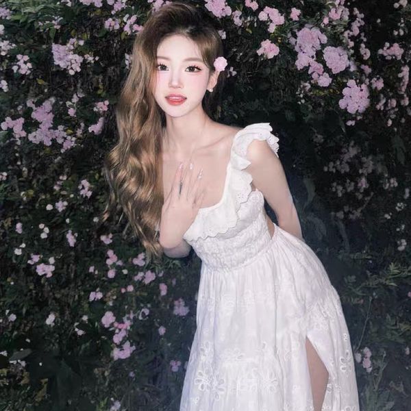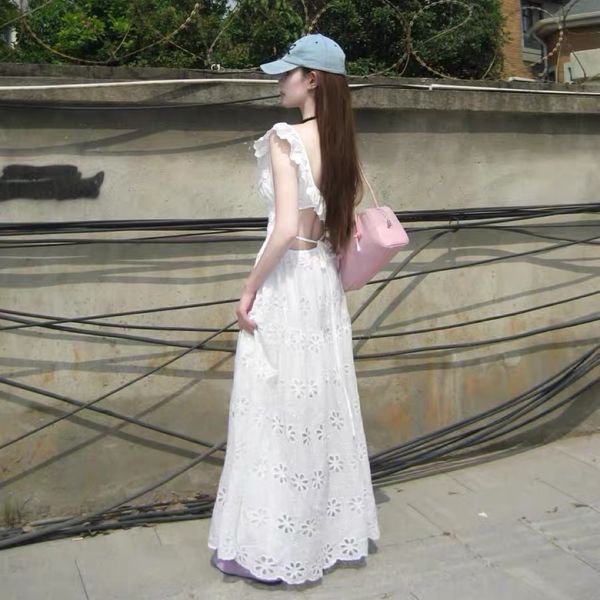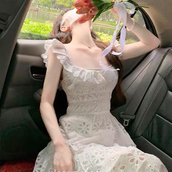White Elegant Lace Sexy Style Dress Women Summer Korean Fashion Sleeveless Sweet Dresses New Cute Hollow Out Slim Fairy Outfit